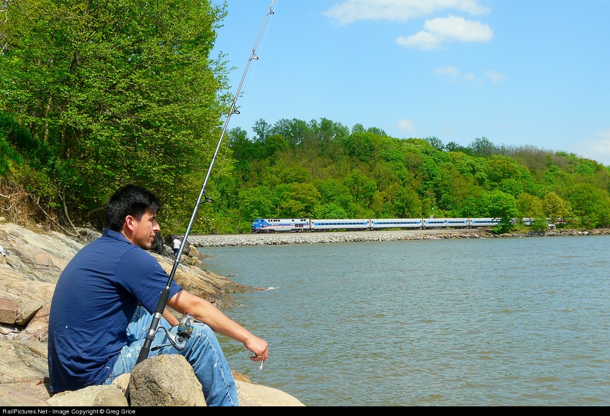 A northbound Poughkeepsie train flies by a fisherman who enjoys a cigarette while patiently waiting for dinner on a bright sunny Mother's Day.