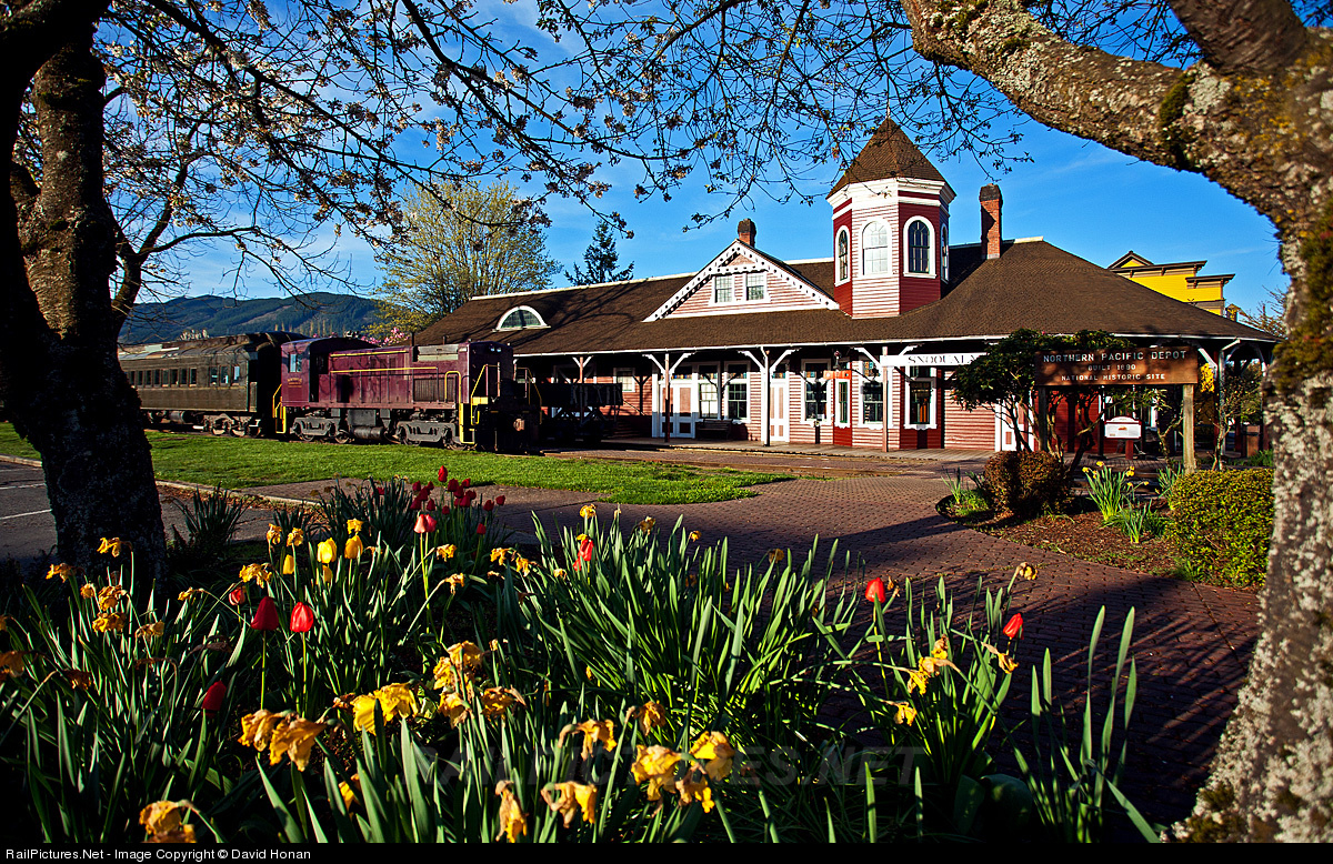 Sunrise on a spectacular spring morning finds the Northwest Railway Museum's excursion train parked in front of the Snoqualmie Depot, built in 1890 by the Seattle, Lake Shore and Eastern Railway and restored to its original appearance in 1981.