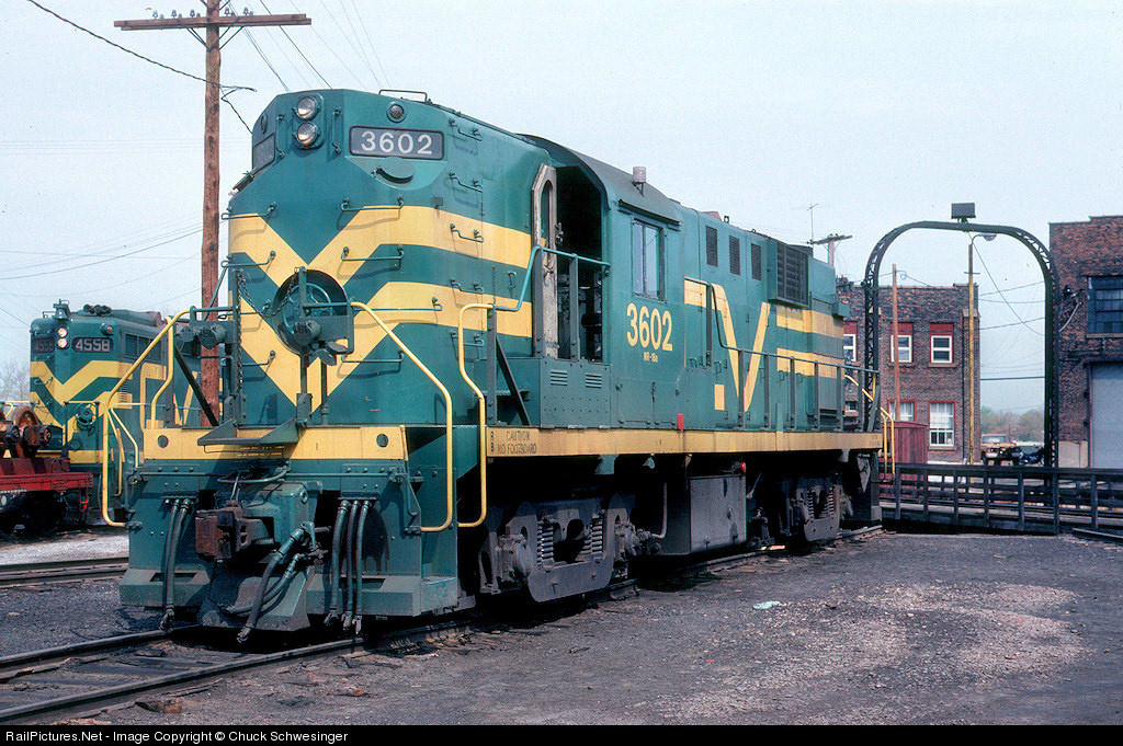 CN's smaller US roads seemed to flip power around every now and then in the 70's and 80's. The group of RS-11's made a couple trips from the CV to the DWP. Geeps also were swapped fairly often between the GTW and CV. It just added to the variety and made for some interesting train watching. Ex DWP 3602 has been given a coat of CV green and yellow and is spotted at the CV shop/roundhouse complex in St. Albans.