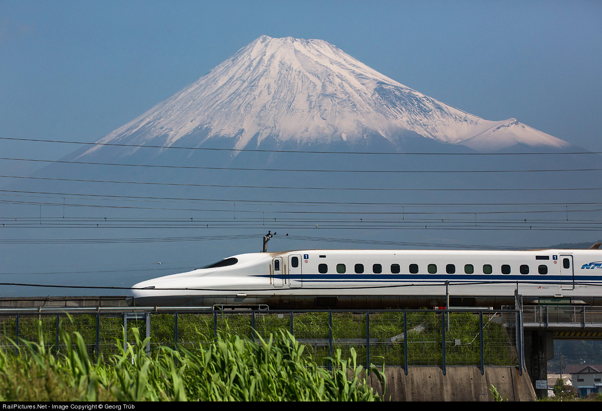 Shinkansen series N700 16-car set # Z 47 passes 3776 meter high Fuji vulcano with 270 km p.h. on a "Nozomi" service from Tokyo to Hakata. The 81 trainsets of this type, capable to run with up to 300 km p.h. on the Sanyo-Shinkansen, were built from 2007 to 2012.