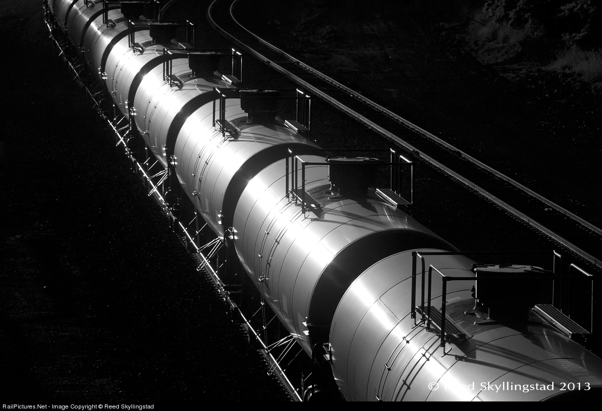 Loaded oil tankers glint in the last few minutes of a great Spring day. Passing through the Columbia River Gorge, these oil cans will travel through Vancouver, WA, then north on BNSF's Seattle Subdivision to get refined.