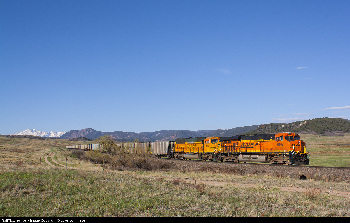 | With Pikes Peak looking on in the background, BNSF 6162 gets a roll on its northbound coal empty, as it starts its descent from the Palmer Divide. |