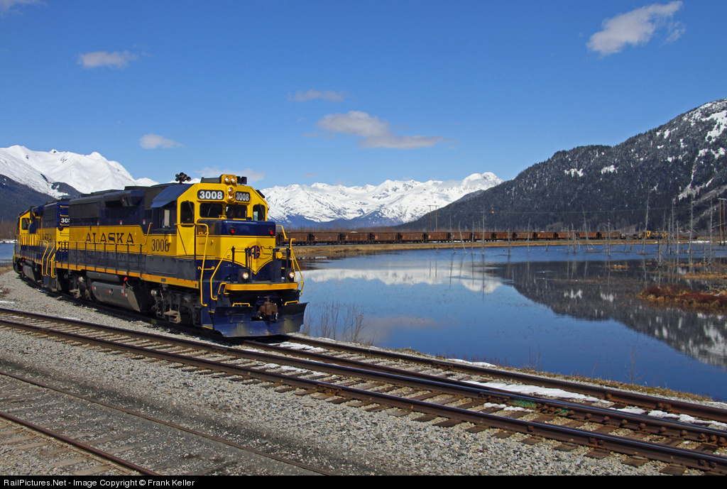 An Alaska Railroad ballast train negotiates the south leg of the Wye at Portage, having just cleared the mainline for a southbound passenger train. Their chore for the day will be to spread ballast at Spencer before tying up for the night at Crown Point. Notice this train still operates with a caboose.