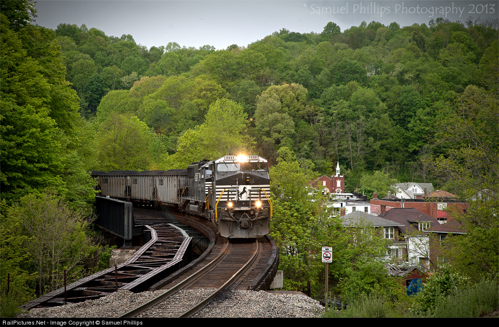 On a gloomy morning along the former Virginian Railway, No. S10 crosses a short trestle in Matoaka, W.Va., with what's left of the town looming below. In the late 80's, Norfolk Southern removed the adjacent track making this a single-track mainline between Princeton and Mullens. Also, the former Norfolk & Western Bluestone Branch runs underneath the trestle which spans south to the Pocahontas mainline at Coopers. This train has just made a pick-up at Clark's Gap, and is beginning the 120 mile trek to Roanoke with an inter-divisional crew on board.