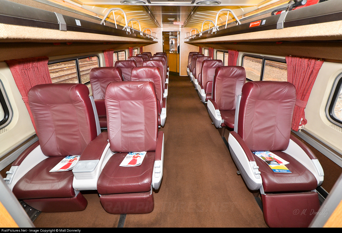 First Class Conference Club car #9800 (former Metroliner) features 2+1 business class style seating at one end.