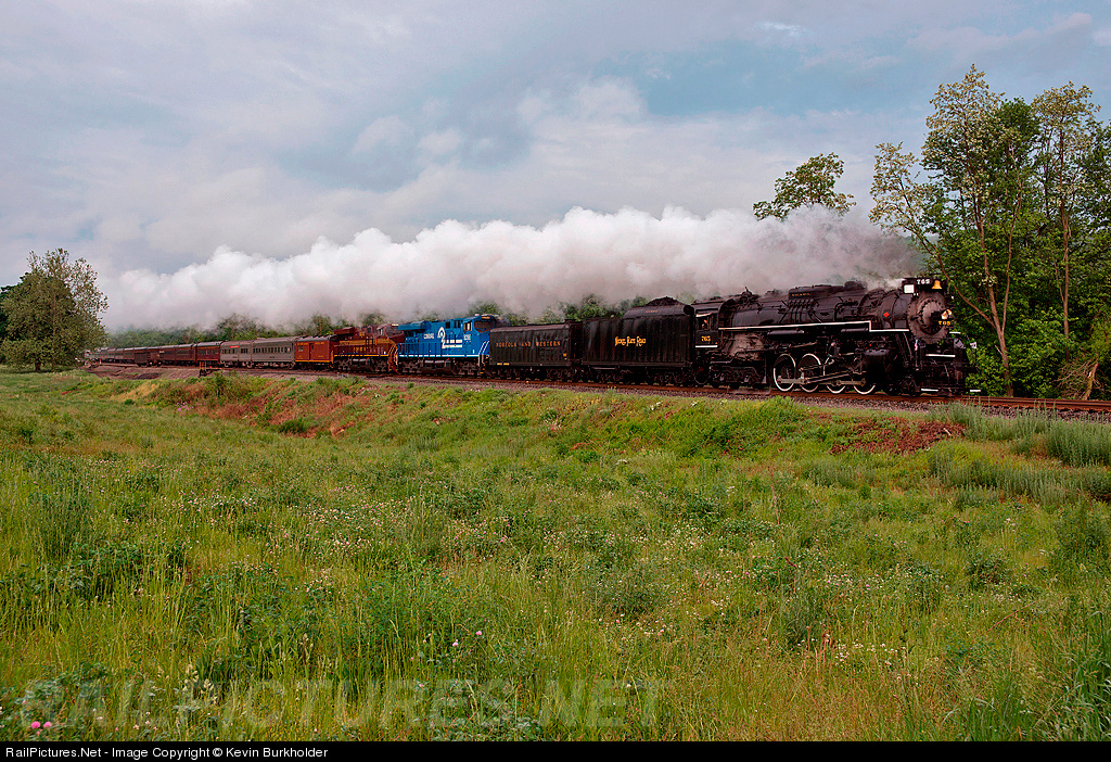 | The May 23 deadhead move of the Nickel Plate (Fort Wayne Railroad Historical Society) Berkshire 2-8-4 765, NS Heritage Conrail and PRR ES44ACs - 8098 and 8102 - and a healthy 24-car train in town is enroute to Enola, Pennsylvania to stage for the weekend trips that will originate in Lewistown, PA and head west over Horseshoe Curve and back. |