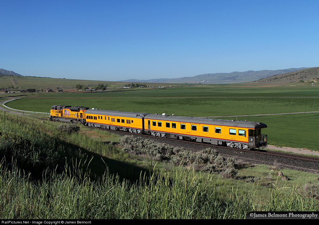 Union Pacific ran a passenger special for local management between Salt Lake City and Las Vegas on May 24, 2013. The little train is captured descending the Sharp Subdivision approaching East Starr. The observation cars are of SP heritage, the 'Stanford' and the 'Sunset'.