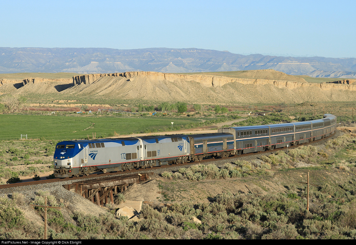 Amtrak #6, the eastbound California Zephyr, is pictured here rolling alongside the last green fields it will see for many miles as it enters the barren eastern Utah desert. The train has been following the Price River ever since it left Soldier Summit about 45 miles ago. It is the Price River that makes that alfalfa field possible even though it would be called a creek, and a pretty small one at that, anywhere else.