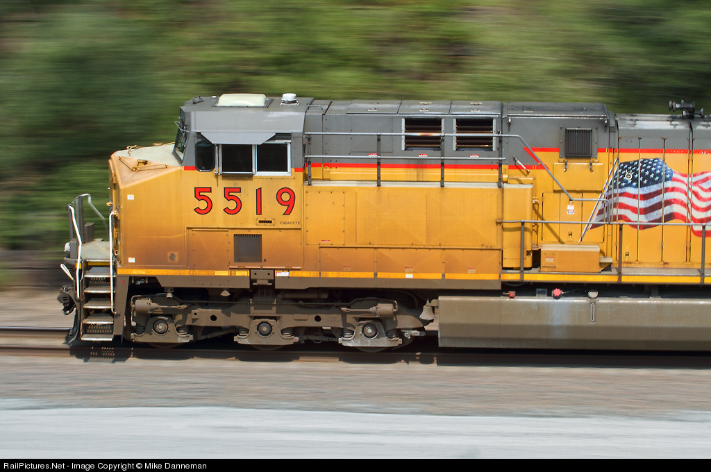 A westbound Union Pacific freight led by AC4400CW-CTE No. 5519 is just east of Arlington, Nebraska, on August 16, 2012. In a panned photograph, the American flag on the locomotive’s side seems to be whipping in the wind, seemingly honoring all those men and women who died while serving in the United States Armed Forces. Happy Memorial Day 2013!