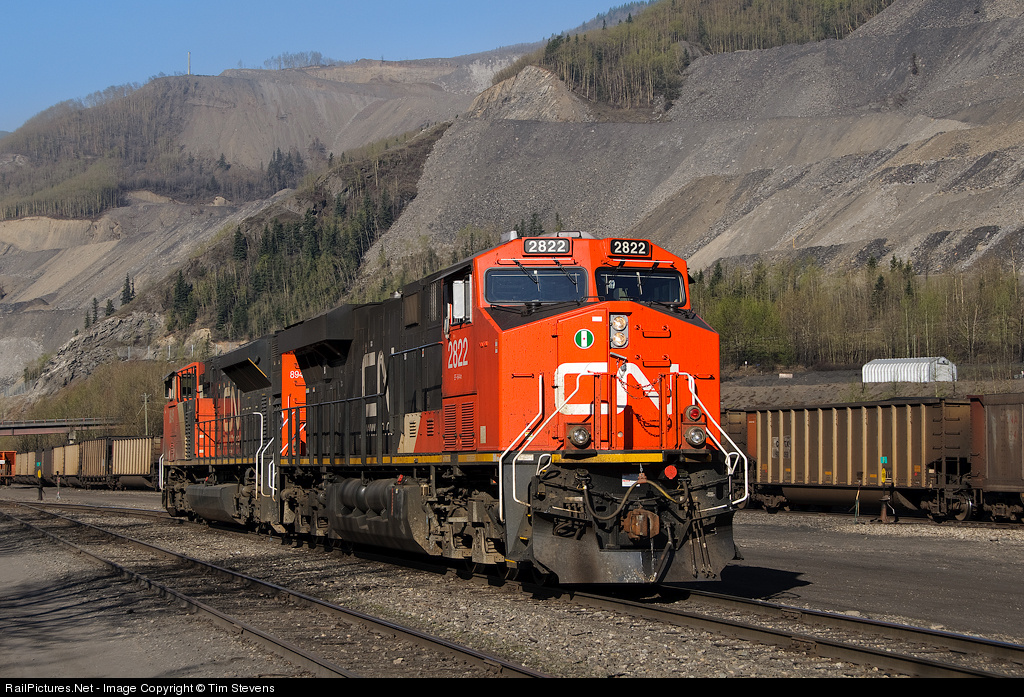 | Commonly assigned to coal trains, CN's first batch of AC powered GEVOs are inevitably starting to get dirty. CN ES44AC 2822 idles at Winniandy waiting to be put on a southbound load. |