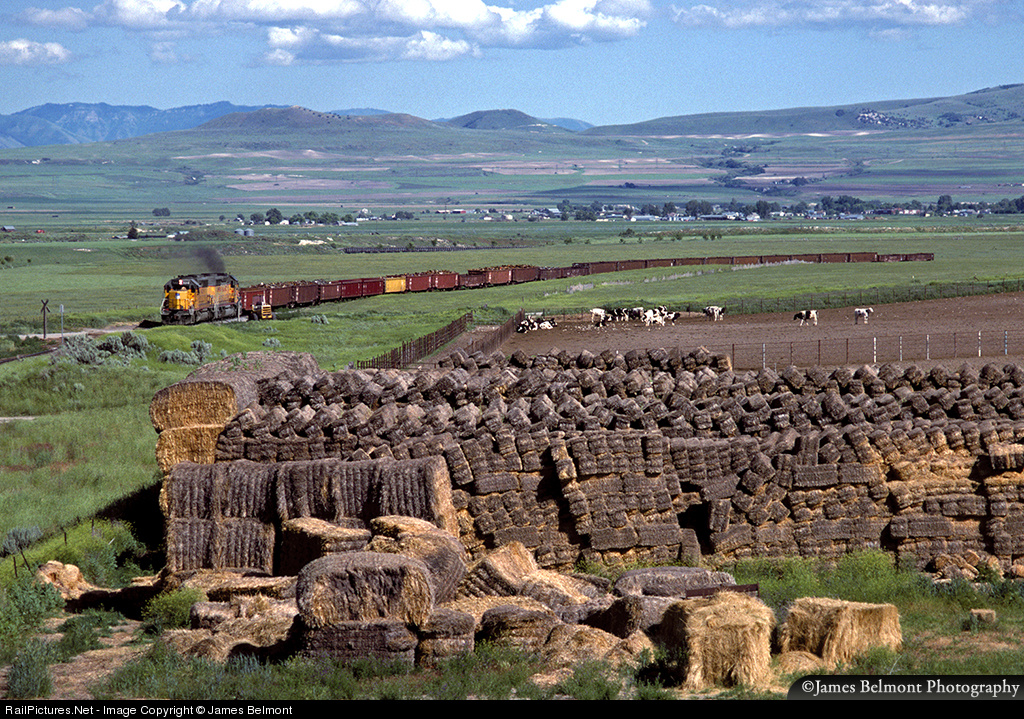 Union Pacific's Malad Local rambles through the Malad and Bear River Valleys with 26 loads of scrap metal for Nucor Steel. A local dairy farmer appears to have the corner market on the stockpiling of straw.