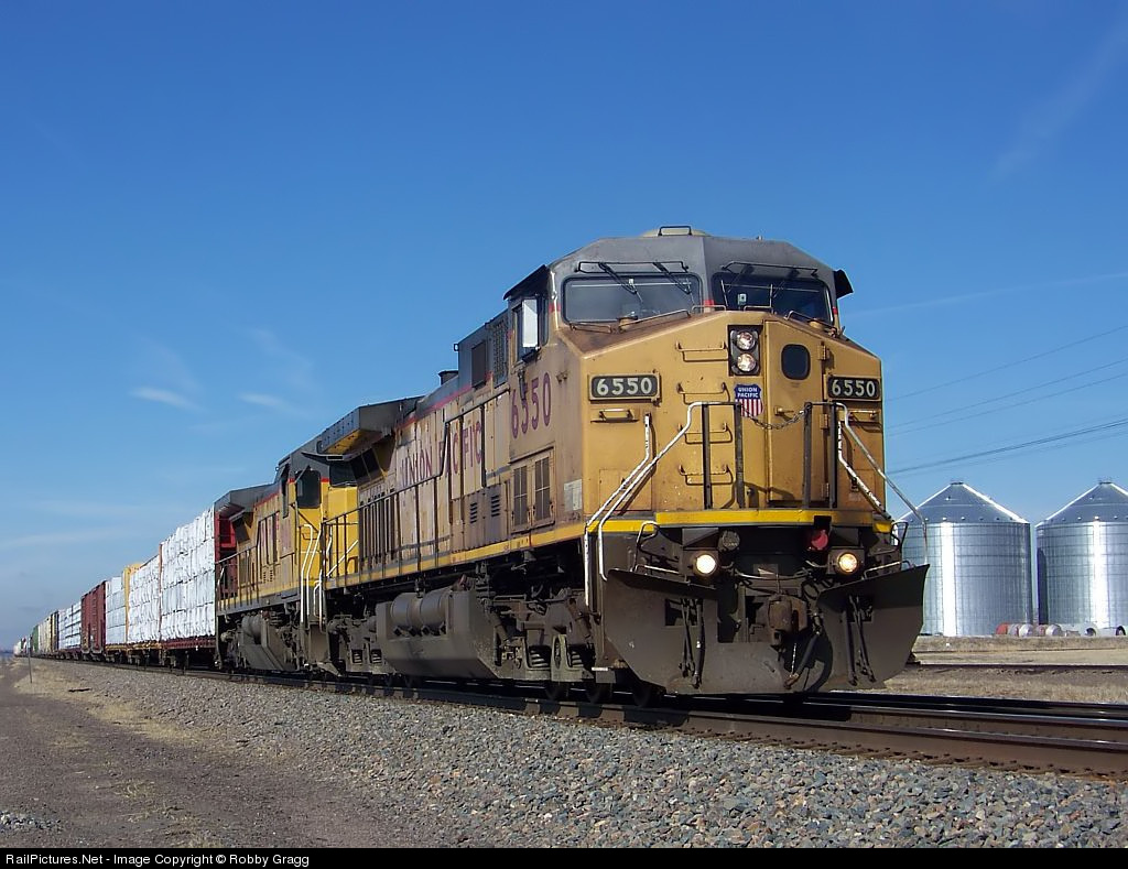 | UP 6550 leads a manifest east, just east of Sutherland, coming up to the junction where the South Morrill Sub merges into the Sidney Sub for the rest of the trip to Bailey Yard. |