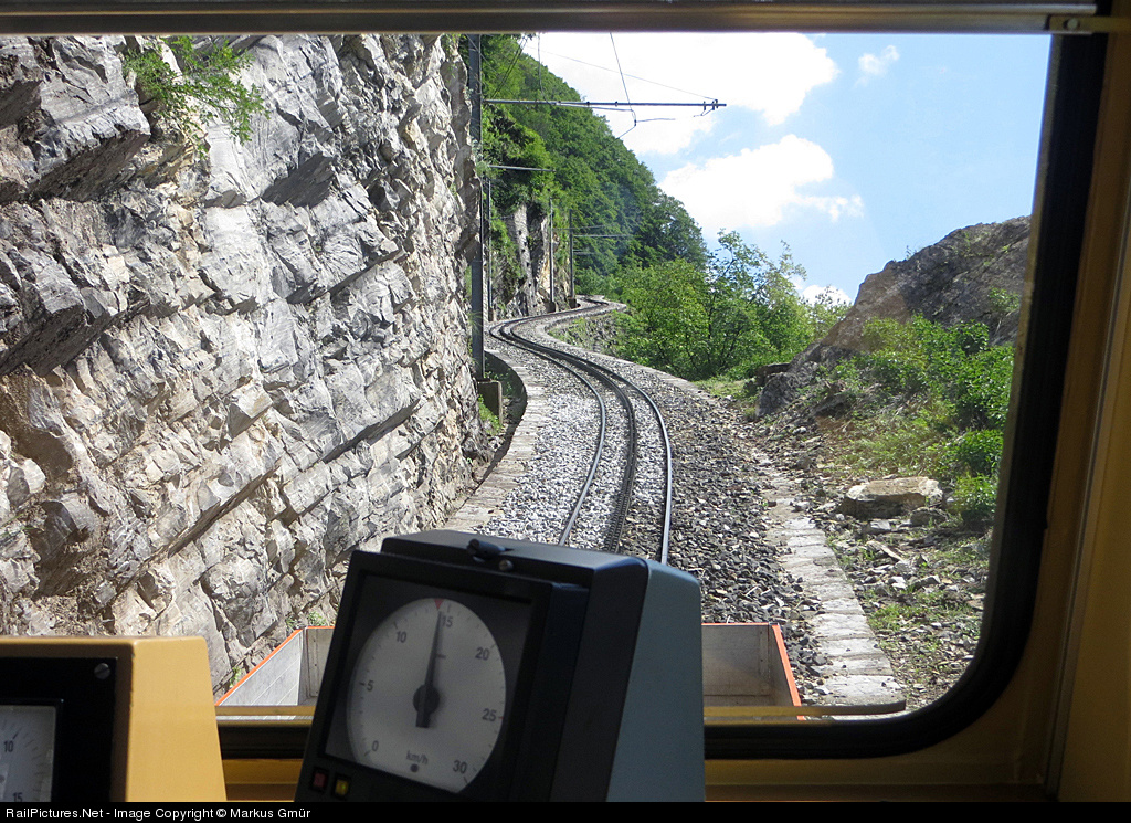 | View from the cab at the rear of the cogwheel-railcar from Generoso Vetta (1594 meters over sealevel) to Capolago (274 meters over sealevel) between San Nicolao and Capolago. At this part the track snakes along the rocks. The speed ist 14 km/hour |