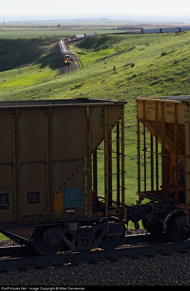 Union Pacific’s MRONY manifest freight from Salt Lake City to Denver is circling Big 10 Curve on Memorial Day morning 2013. The head end is in the background approaching West Rocky, while the rear of the train is still passing through Eisele (formerly known as Clay). The green grass of spring lights up brightly in the low morning sun.