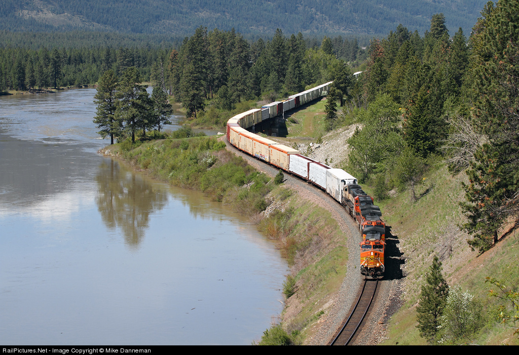 | An eastbound BNSF manifest freight crosses the Thompson River as it skirts the scenic Clark Fork east of Thompson Falls, Montana on May 19, 2011. |