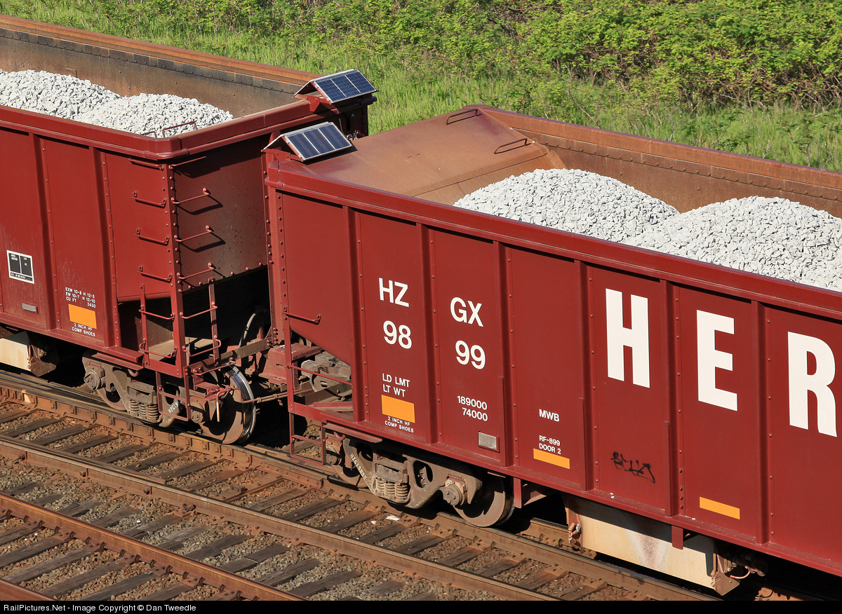 A detail shot of a pair of solar panels mounted on two Herzog ballast cars. The panels supply the necessary power to open the doors to drop ballast remotely via GPS from the lead locomotives.