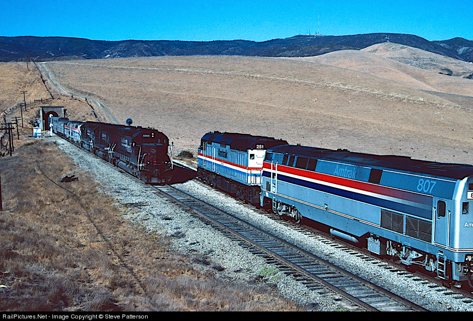 Amtrak's Coast Starlights Nos. 11 and 14 meet on the mountainside of Cuesta grade at Chorro, Calif. on Oct. 8, 1996 as southbound No. 11 exists Tunnel No. 11, the last of six tunnels on the descent down the Santa Lucia Range. With 8666 on the point Train 11 is led by three sooty SP EMD SD units, doubtlessly assigned to helper service at San Luis Obispo at the foot of the grade and hitching a ride on Amtrak, allowing the dispatcher to have one less train movement to govern.