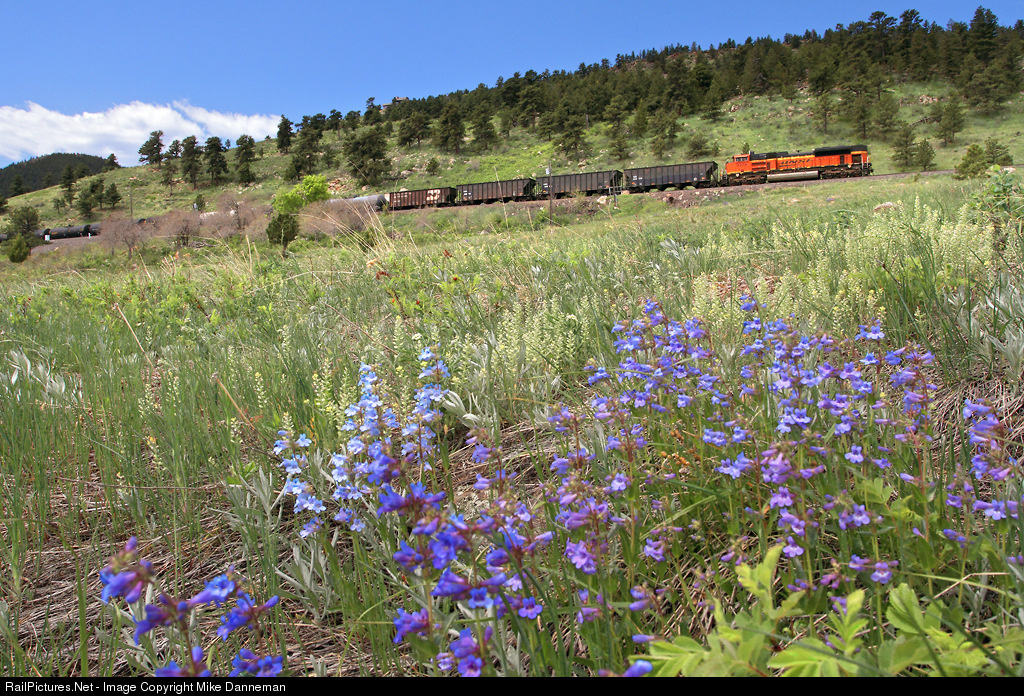 A BNSF manifest freight drops downgrade through Eisele, Colorado, on May 27, 2013. Three GE Dash 9s on the point of the eastbound train are approaching the east switch of the siding, while in this view, lone DPU EMD SD70ACe No. 9379 holds back the rear of the train. Eisele is the new name for Clay siding, recently renamed by UP to honor a retiring official.