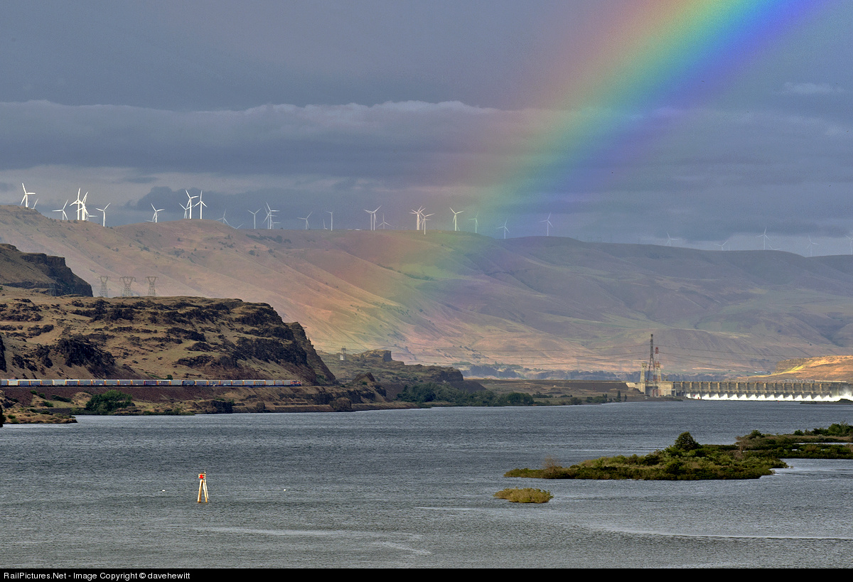 Dark clouds head east along the Columbia river gorge. A brief ray of sun produces a rainbow which highlights the BNSF freight also heading east.