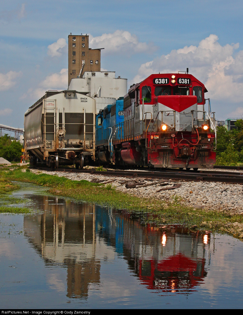 | A couple Wheeling units in earlier EMD demonstrator schemes switch out hoppers at the Bunge elevator by the west end f Bellevue Terminal. The wind died down just enough to grab a decent frame of the train being reflected in some standing water next to the right-of-way. |