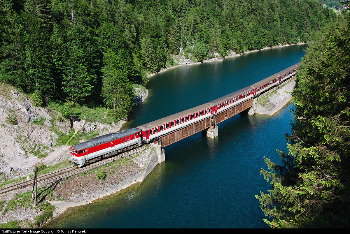 Fast train 810 "Horehronec" from Kosice to Bratislava is heading thru beautiful nature of Slovensky raj region near Dedinky village. The water reservoir is called Palcmanska Masa.