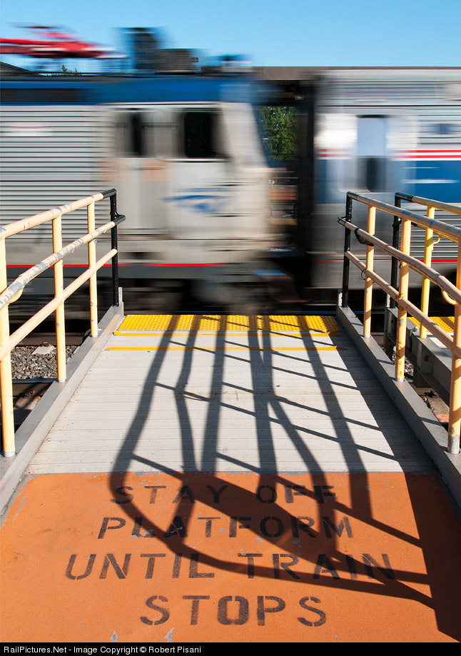 Good advice on a bridge plate which spans track 4 at Edison Station on the Northeast Corridor as an evening rush-hour westbound Keystone Service for Harrisburg races through Edison on track 2. Track 4 is currently out of service for a tie renewal project between COUNTY and LINCOLN Interlockings on the Northeast Corridor. Bridge plates will be used at Edison to handle the usual rush hour crowds as trains will now be stopping on track 3.