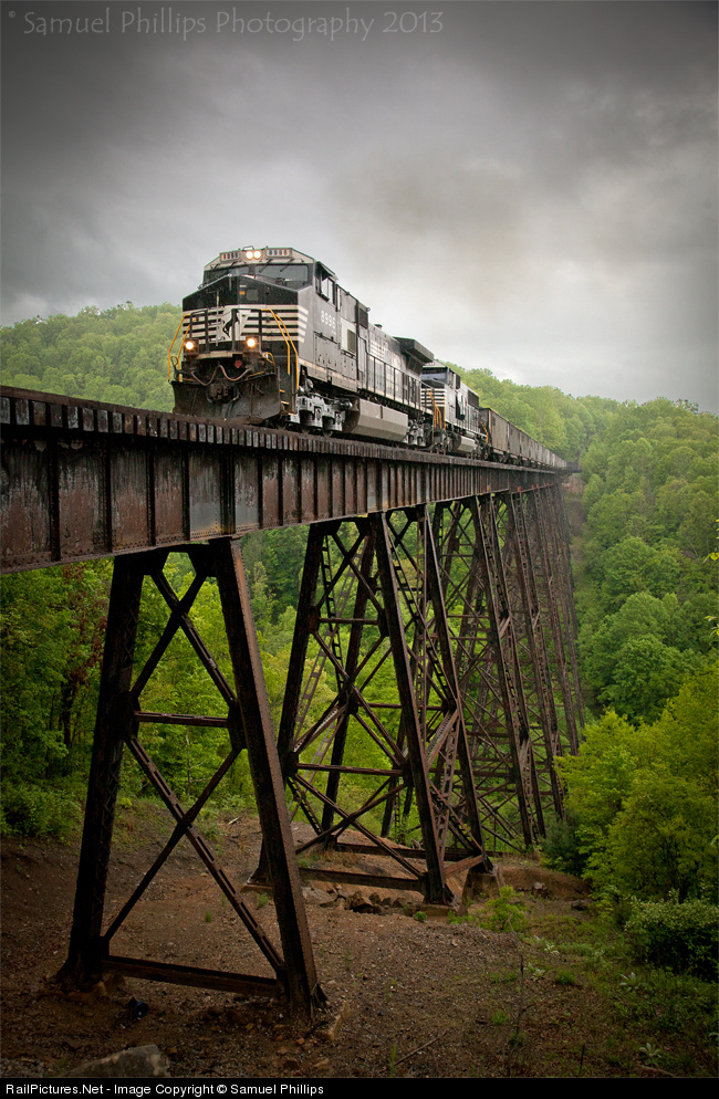 In this scene, heavy loaded coal drag No. 810 soars across the massive Black Lick viaduct in Kegley, W.Va., on the former Virginian Railroad, with long train en-route to be exported at Lamberts Point. Already on a 0.6% grade with at least 18,000 tons, the two locomotives are down to a crawl, as they battle the hill, barely making it before a stall-out occurred. After topping the hill, it will be an all down-grade run to Narrows, where the train will once again ascend to Blackburg back on the rails of the former Virginian.