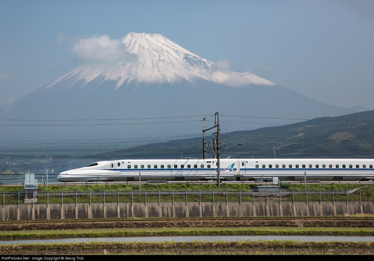 The newest shinkansen type on the Tokaido and Sanyo line is the N700 A (A for advanced). This particular set G 4 was delivered from Nippon Sharyo on january 22, 2013. Externally the same as the N700 series, the N700 A trains will include modified brake discs, bogie vibration detection, and ATC improvements. The train is passing 3776 meter high Fuji volcano in a distance of about 25 kilometers, with 270 km per hour velocity, the highest speed on the Tokaido Shinkansen.