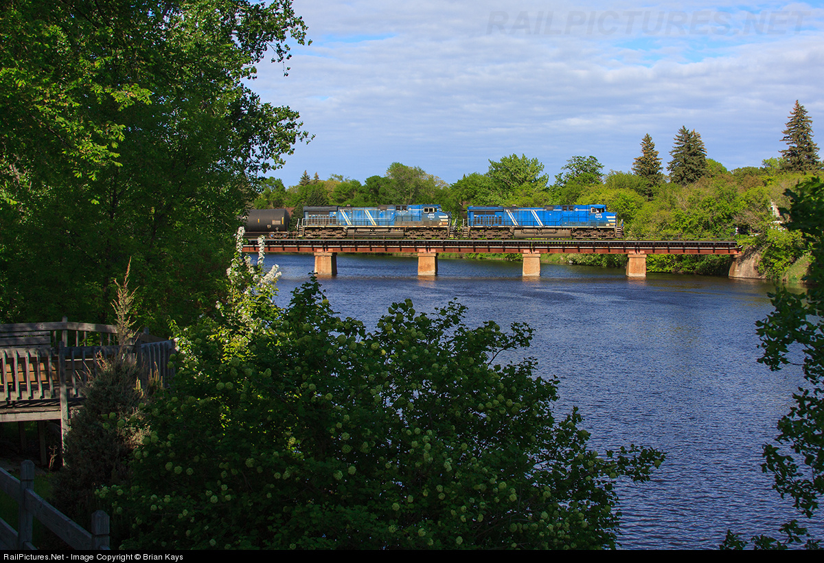 | A Canadian Pacific manifest departs eastbound from "TR Falls" at 1800 after refueling. The area finally looks like summer after a long winter and prolonged spring. Here the train crosses the Red Lake River in downtown Thief River Falls with two leased AC44's in control. |
