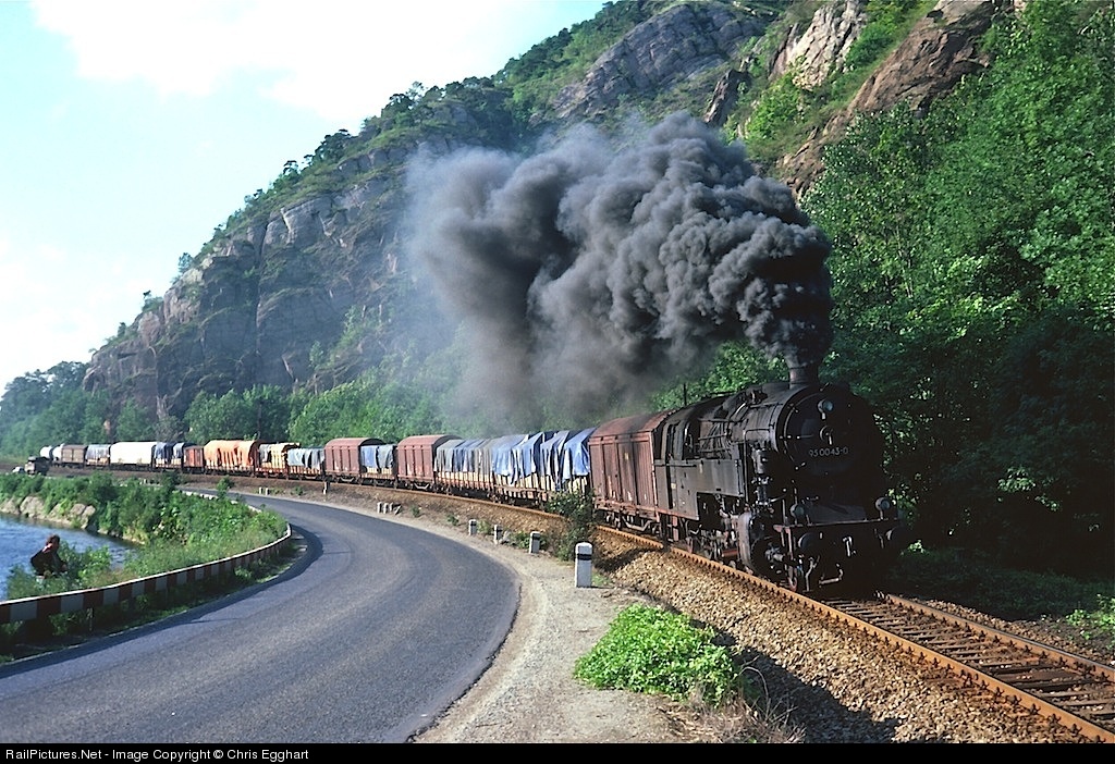 A BR95 pulls a mixed freight out of Saalfeld, East Germany. The fireman has just cranked up the oil jets to maintain steam for the upcoming climb to the hill town of Probstzella.