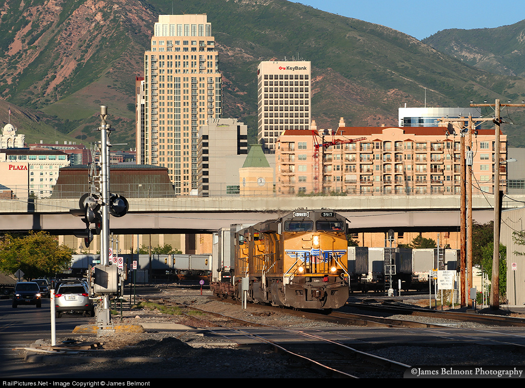| Union Pacific's Denver, CO to Salt Lake City, UT expedited intermodal zigs and zags through Grant Tower at CP C782, Ninth West in Salt Lake City. |