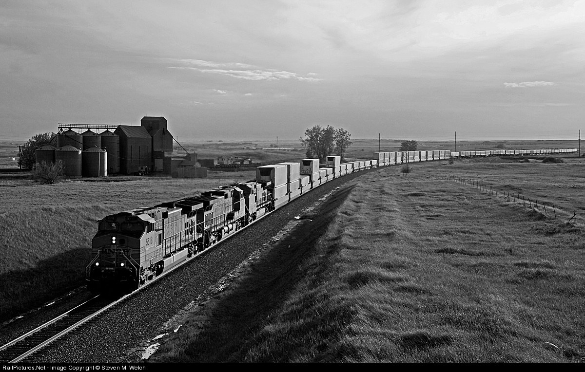 High priority intermodal traffic from South Seattle to Chicago, IL works hard through Epping, ND and up the .66% grade on the new alignment, passing one of two elevators on the original route through town.