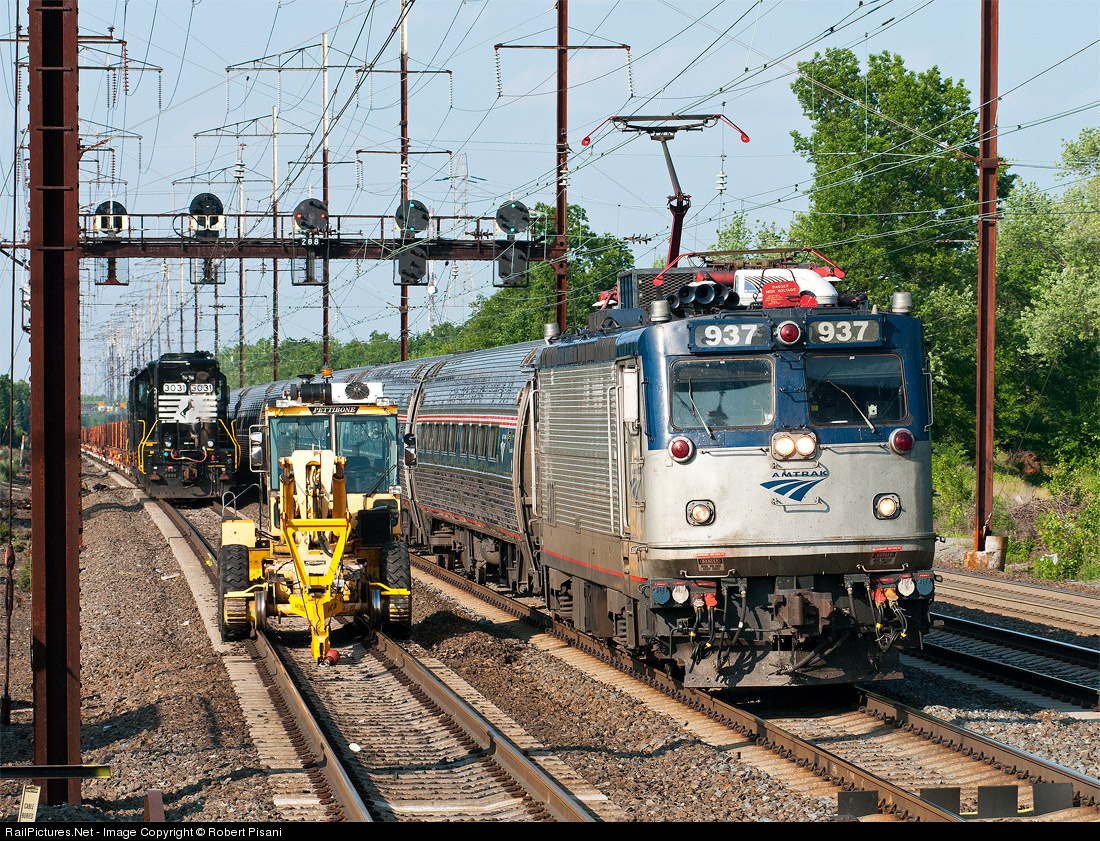 This busy scene provides concrete proof of Amtrak's ongoing tie replacement project on the Northeast Corridor in New Jersey. NS 3031 and 3029 are tied down on the out-of-service track 4 with a loaded tie train behind a Pettibone crane. Passing the work area at speed, with horn blaring, is Amtrak 937 on a Northeast Regional train to Washington, DC. Several NS GP40-2s are leased for the maintenance season, and as ex-Conrail units, they are equipped with the necessary cab signals and equipment to operate on the NEC.