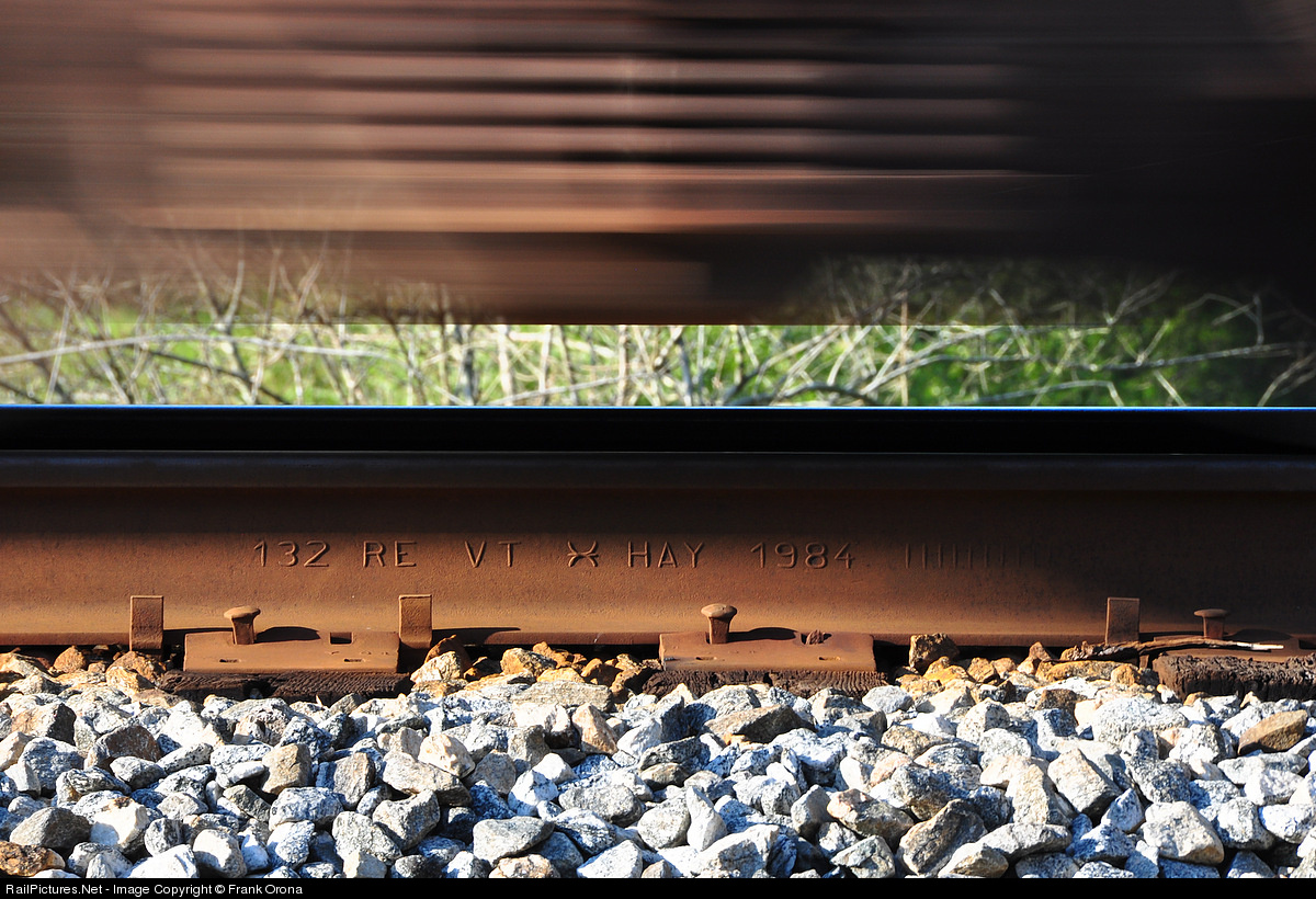 As NS 137 glides over the track in Gold Ridge, it illuminates rail rolled by the French firm Hayange- at their rail mill located in Hayange, France during the year of 1984.