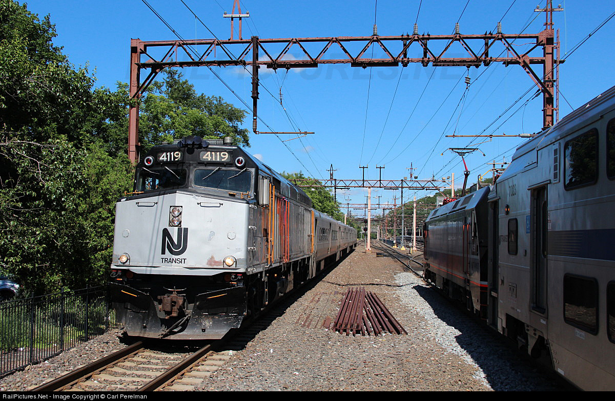 | NJT 4119 is among a few F40PH locomotives still in service on NJ Transit. It is leading train 1001 into Dover, passing a MidTOWN Direct train on the adjacent track. |