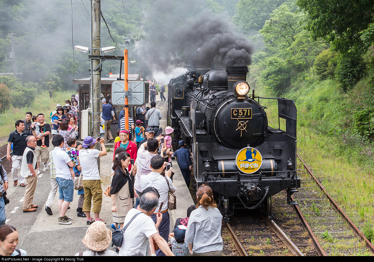 | Short service stop for the "SL Yamaguchi" steam train from Shin-Yamaguchi to Tsuwano in Niho station, observed and photographed by many Japanese families and just a few "long noses" from Europe. |