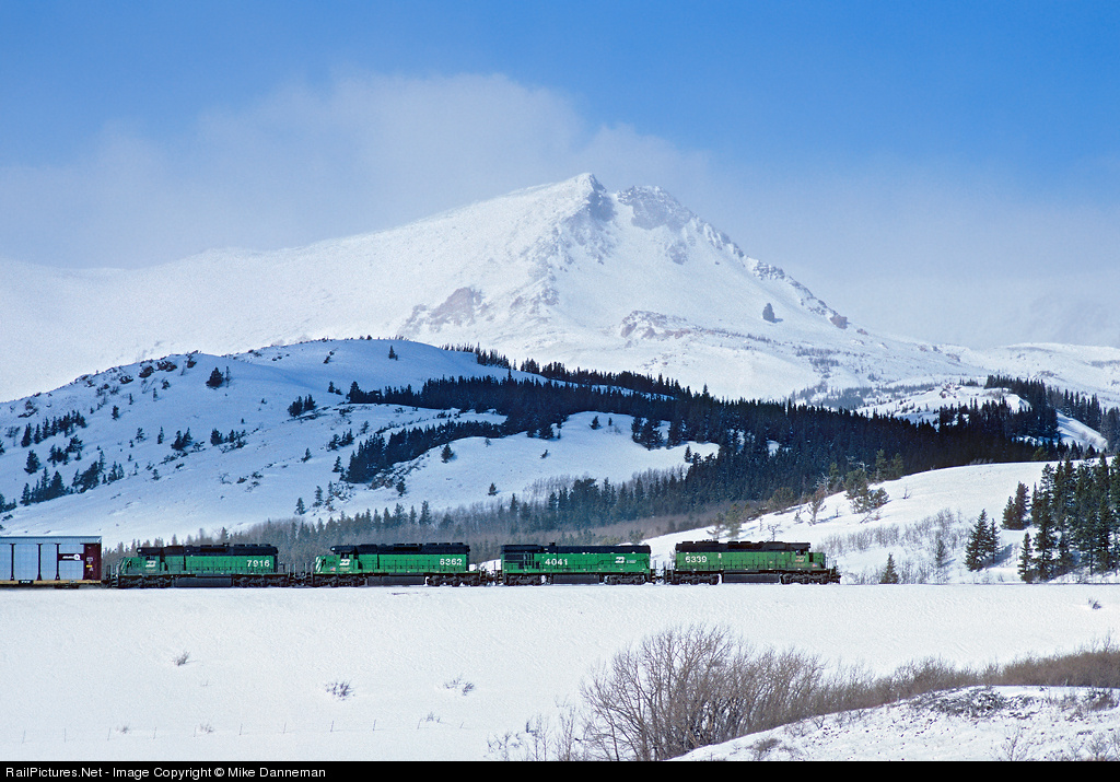 Burlington Northern Santa Fe train No. 14 heads east through the snow at Bison, Montana, on February 28, 1997. Former Colorado & Southern SD40 No. 6339 leads the train into an oppressive wind, while in the background snow blows off the awesome peaks of Glacier National Park.