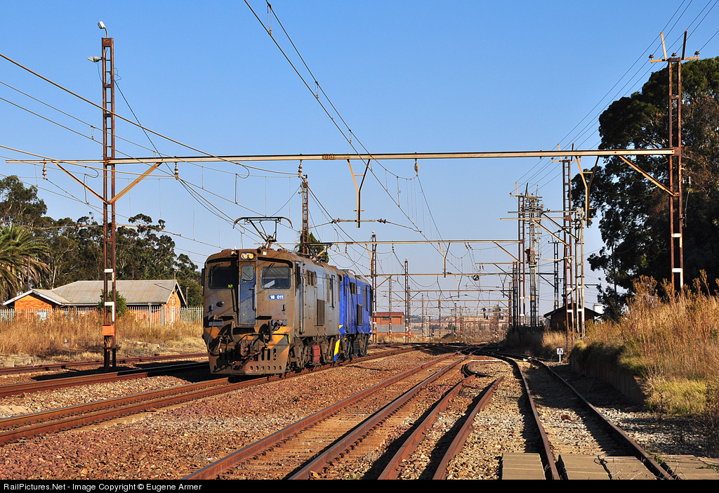 With no load on offer, this pair of class 18E's is running light engine through Dryden, heading east to Witbank. The leading locomotive is 18-011, one of the first series of 18E's rebuilt from 6E1's. On the left is the old Dryden station building and signal cabin, kept relatively safe from vandalism by sturdy security fencing. Photograph taken during Tanago's recent South Africa railfan tour.