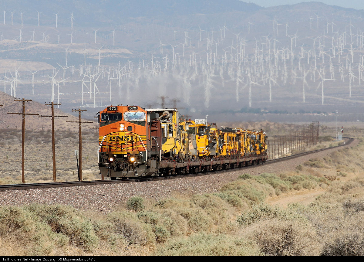 | With the windmill dotted Tehachapi Mountains as a backdrop, BNSF 672 is the sole unit on this eastbound MOW train at Bissell on the Mojave Sub. |