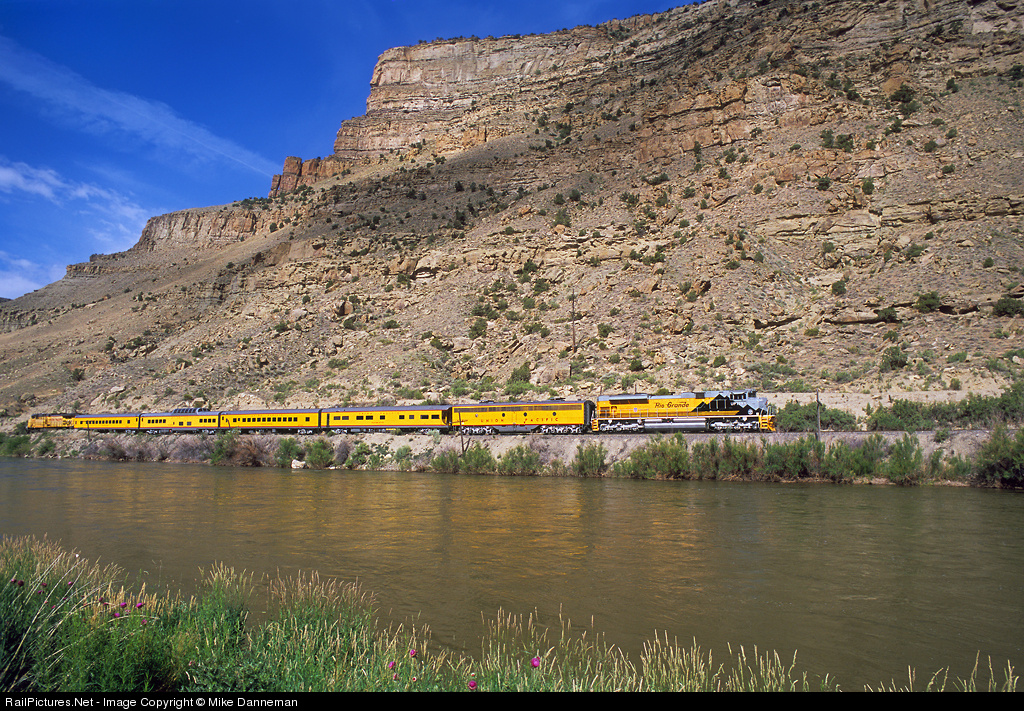 An Operation Lifesaver Special heads east along the Colorado River east of Cameo, Colorado, on June 15, 2009. Powering the train is Rio Grande heritage EMD SD70ACe No. UP 1989 and E9B No. 963B. On the trailing end of the four-car train is a run-of-the-mill AC4400CW for the trip back west.