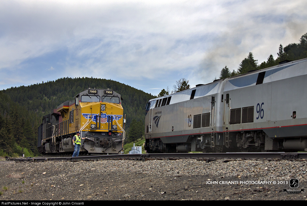 With the coal load in the siding, Amtrak #5 "The California Zephyr" rolls on through the small town of Pinecliffe, Colorado on their way west towards Reno, Nevada. After Amtrak clears, this eastbound coal train will head into Denver, cut off the swing helpers and head east to Chiles, KY.