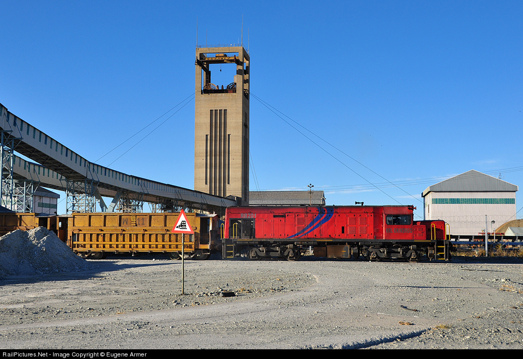 | The class 31 diesel-electric locomotives (GE U12B) were imported from the USA and placed in service on the South African Railways (SAR) in 1958. All have been withdrawn, but a few survive in industrial use with private operators. This example is owned by RRL Grindrod and operates at Welkom, hauling gold-bearing ore from two of Harmony Gold's shafts on the north west side of town. The original high short hood has been replaced with a chopped nose. Taken with permission during Tanago's recent South Africa railfan tour. |