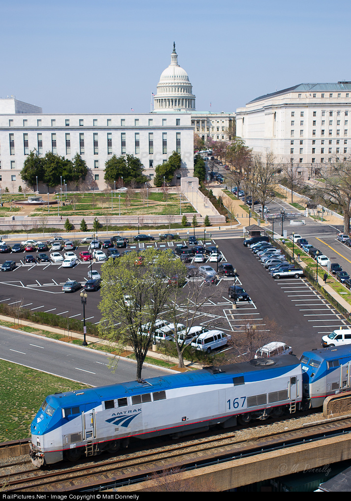 | The Amtrak Silver Star snakes its way out of the nation's capital with the Capitol building in the background. Seeing the monuments pass by is my favorite part of a train ride through DC just south of Union Station. |