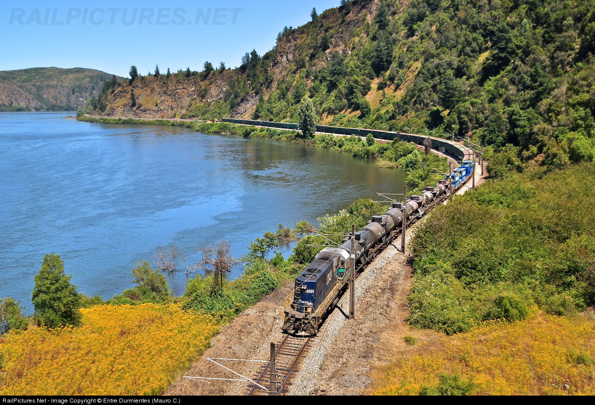 | Train of the railway company FEPASA, known as "Celuloso de Nueva Aldea" passes through the area known as "El Corte" near the town of Buenuraqui, through the railway, between high hills and the river Bio-Bio. |