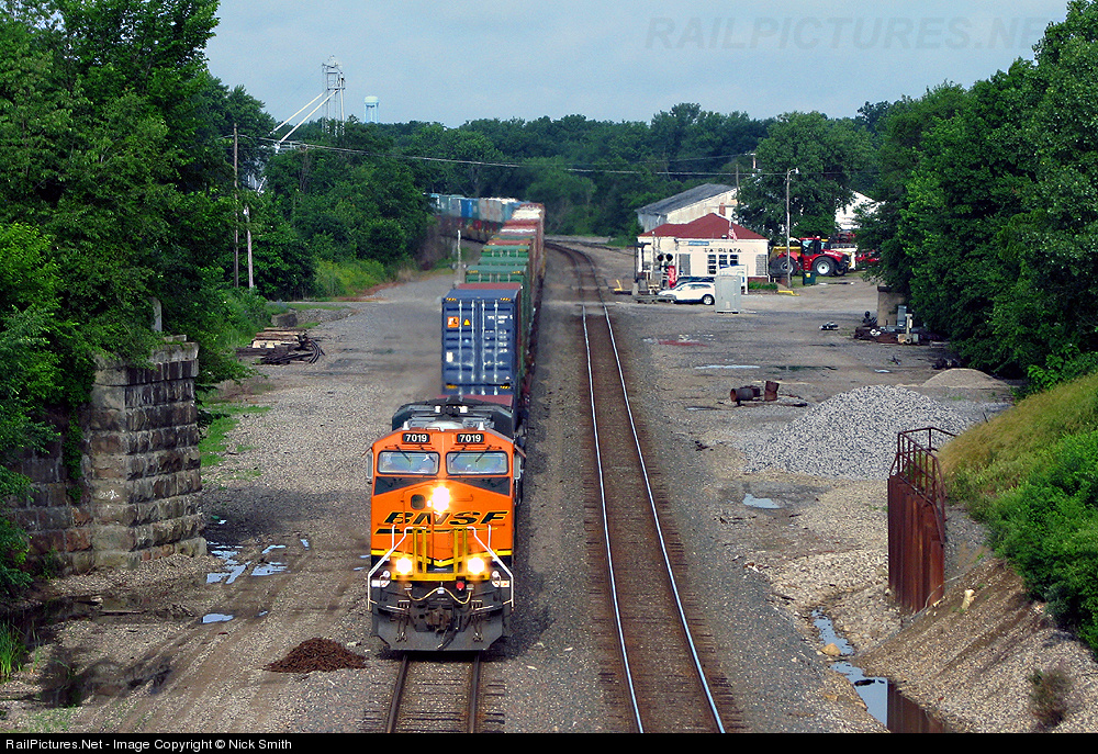 | BNSF 7019 is the lone leader on the point of an eastbound stack train blasting through town on a quiet Sunday morning. The bridge abutment to the left is the remnants of the Wabash main to Des Moines, IA. |