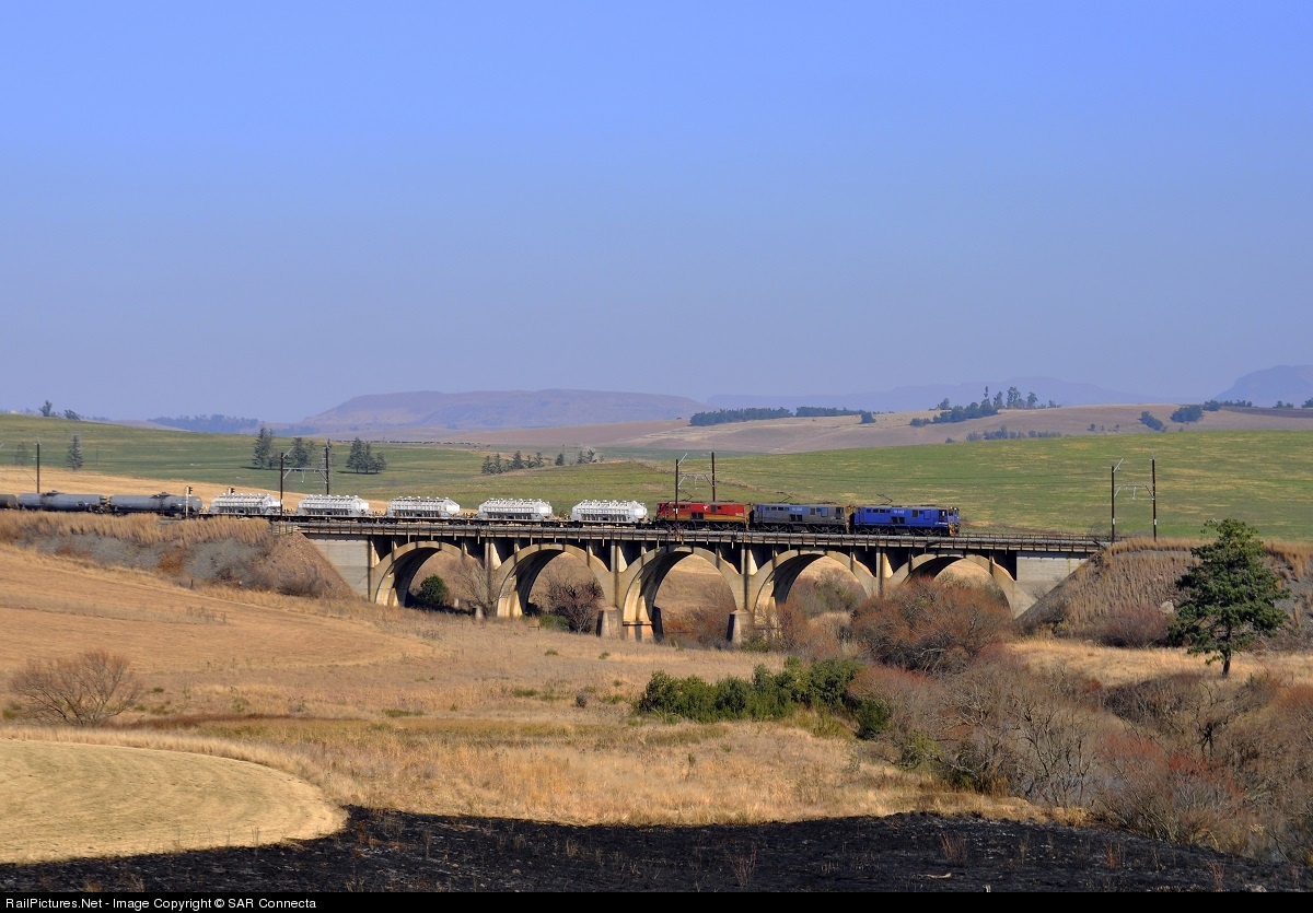 | 18-265 with a load of Sugar Wagons and Diesel Tankers crosses the bridge over the Mooi River. Judging by winter's effect on the lands, it is hard to believe that Mooi River is at the forefront of dairy farming in the KwaZulu Natal Midlands. |