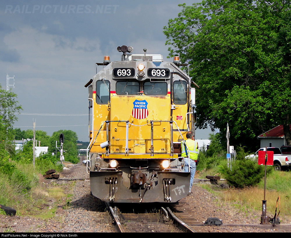 | After waiting for Amtrak to get through town, UP's Sedalia Sub local goes back to work switching industries in the Sub's namesake town. You can see that UP 693 is right at home on this former MP line by the Jenks Blue showing through the UP gray. |