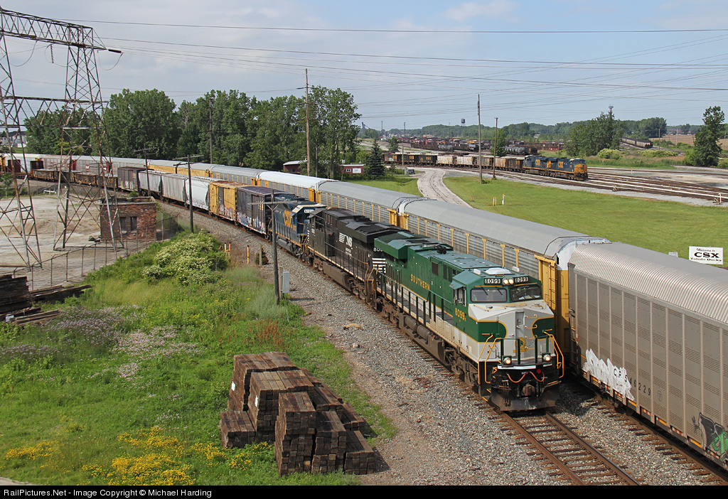 | The NS Southern heritage unit which ran to Grand Rapids, MI at night on Q335 ended up coming back to Toledo on a very late Q334. Here the train curves by the CSX Toledo Docks. |