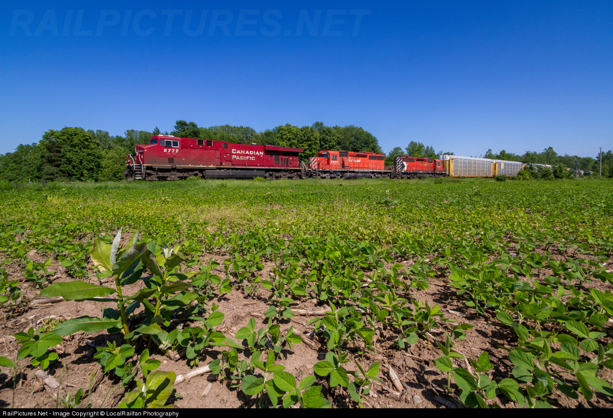| Typically a late night train, CP 247 makes an unusual afternoon appearance as it rolls northbound along the Hamilton Sub and through a soybean field on the way to Guelph Junction. Because of the trailing SD40-2s which seem to be getting even more difficult to catch on the mainline these days, a chase to the Junction ensued. |