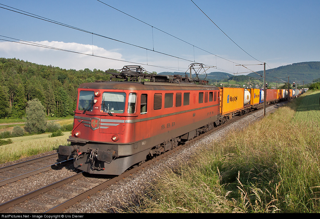 | 55 year old SBB Cargo Ae 6/6 11419, one of only a few still in service, with an intermodal train on the Bözberg north ramp. |